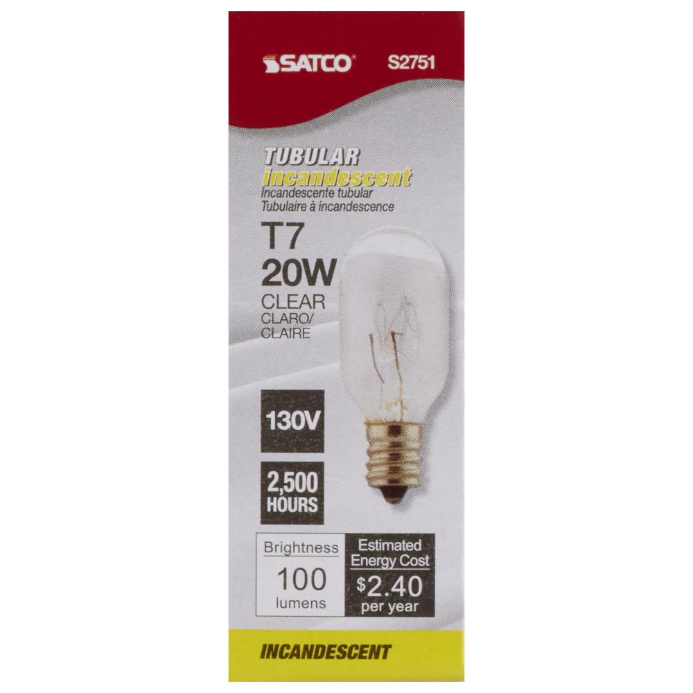 Satco's 20 watt T7 incandescent bulb with 130 lumens and 100 CRI for superior light rendering is perfect for the home or office. The clear bulb features a candelabra base and a beam spread of 360 degrees. With a temperature of 2700 Kelvins, this lamp p