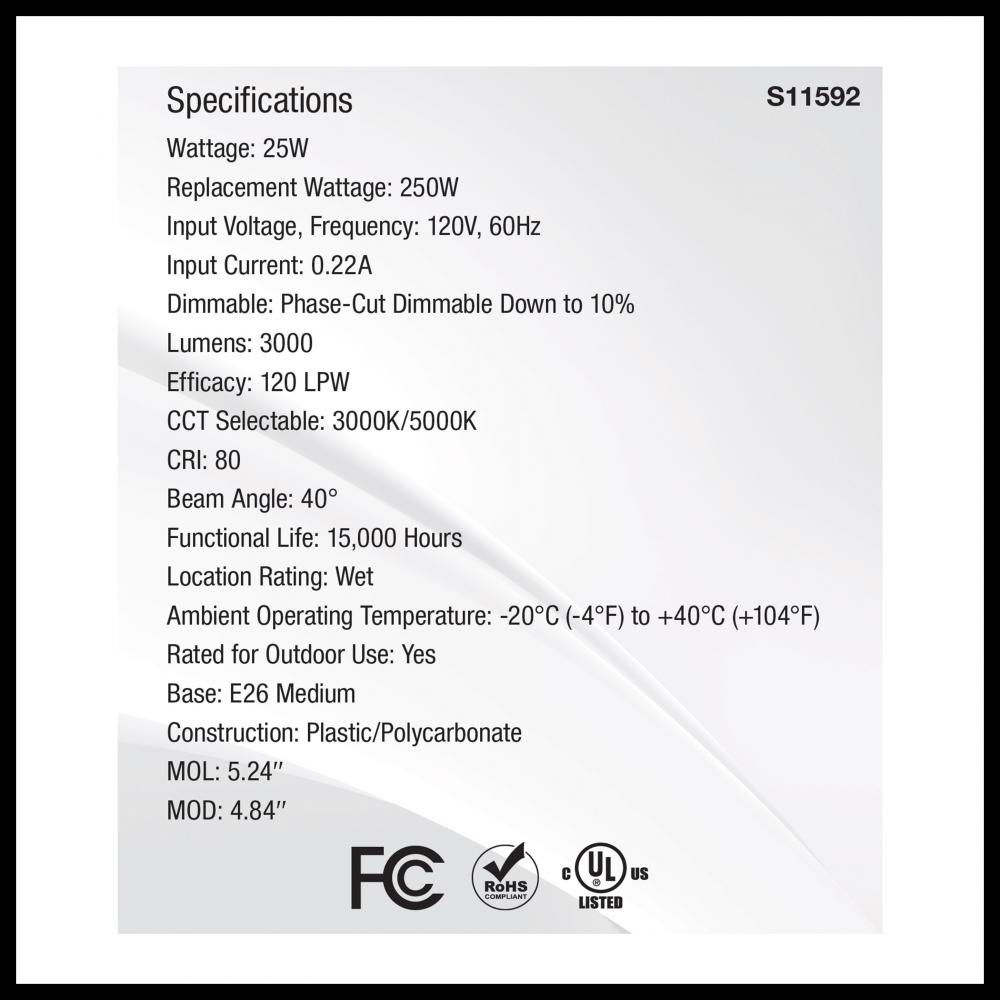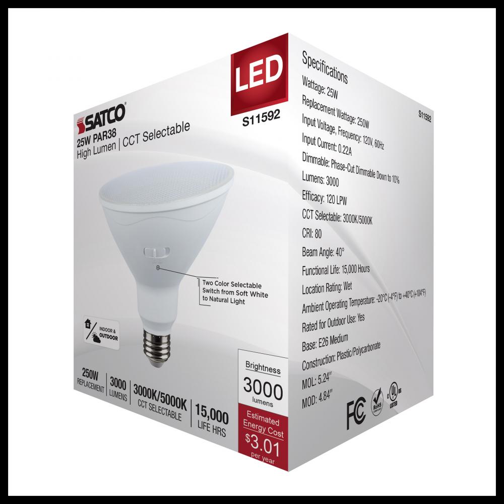 SATCO NUVO's S11592 High Lumen, CCT Selectable PAR38 lamp is designed for versatile indoor and outdoor use. You can choose between a cozy 3000K soft light or a bright 5000K natural light at installation to achieve the desired ambiance. With a powerful