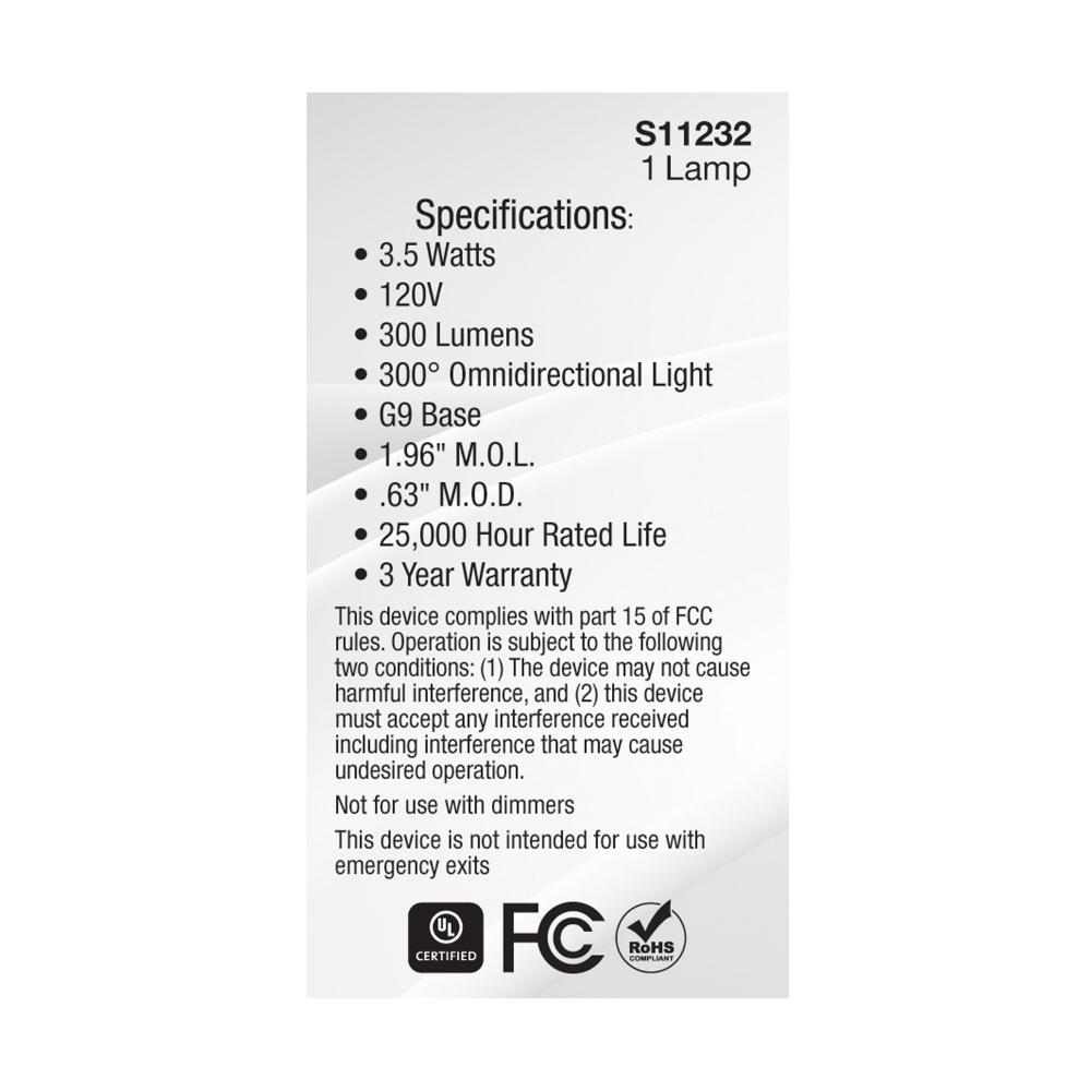 Transform your surroundings with SATCO NUVO's S11232 3.5-watt, T4, G9-base, Halogen replacement lamp, engineered for optimal energy efficiency and affordability. With a CCT of 3000K and emitting a 300-degree omni-directional light, this lamp is ideal f