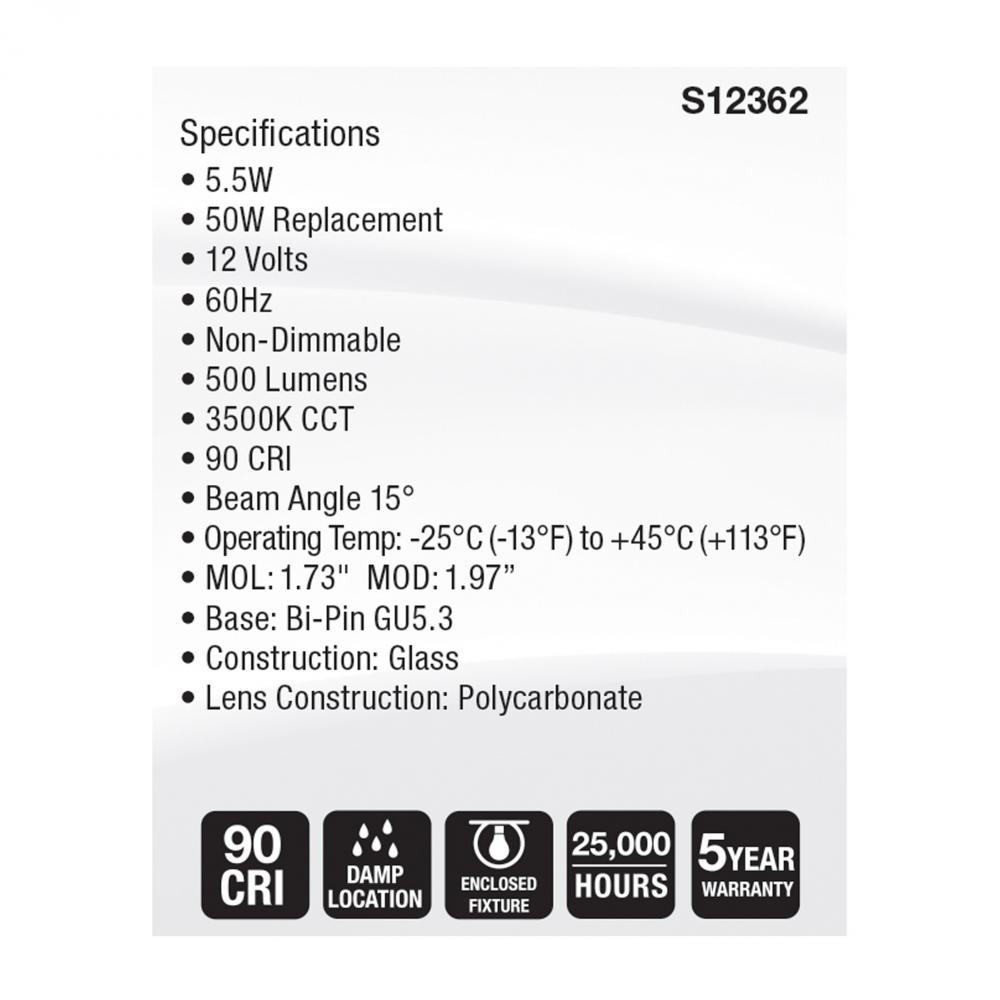 5.5 Watt MR16 LED Spotlight; 3500K CCT; GU5.3 Base; 12 Volt