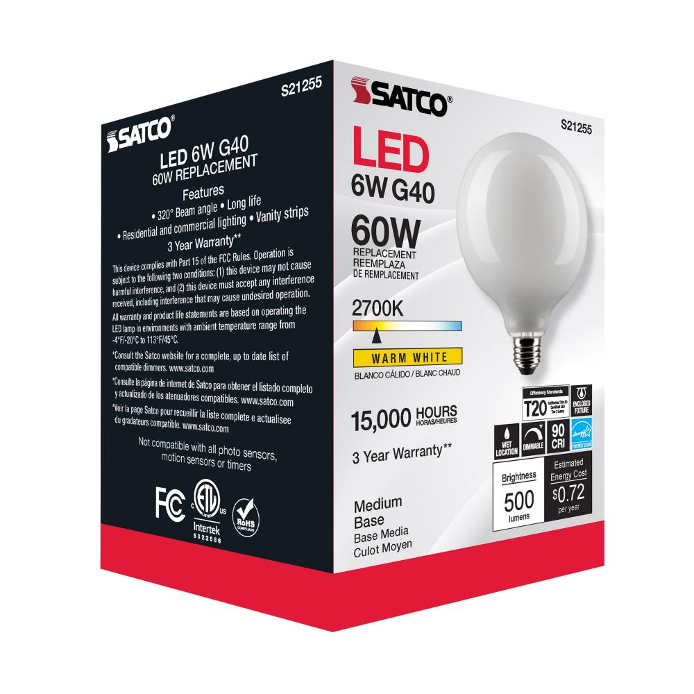 Satco's S21255 6-watt LED lamp is traditional, yet contemporary with its sleek finish and energy saving LED technology. Elegantly illuminate any room in the house with this dimmable, globe shaped bulb. Sophisticated and modern, this lamp delivers 15,00