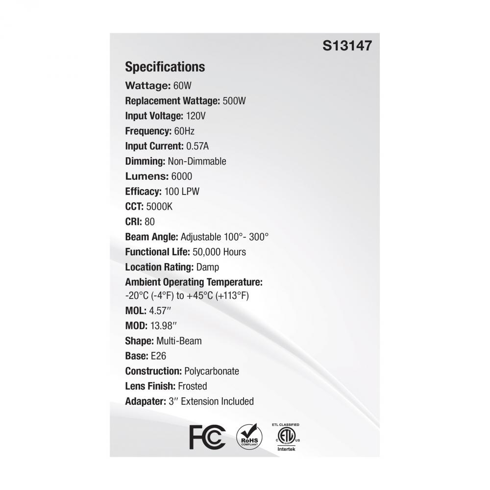 SATCO NUVO's LED Garage and Utility Light, S13147, easily provides ample illumination to garages, workshops, utility rooms and more. Simply screw the E26 base into any standard lamp socket and adjust the LED panels as desired from 300 degrees when clos