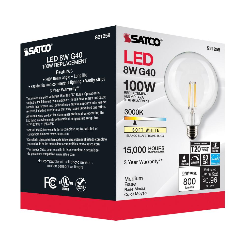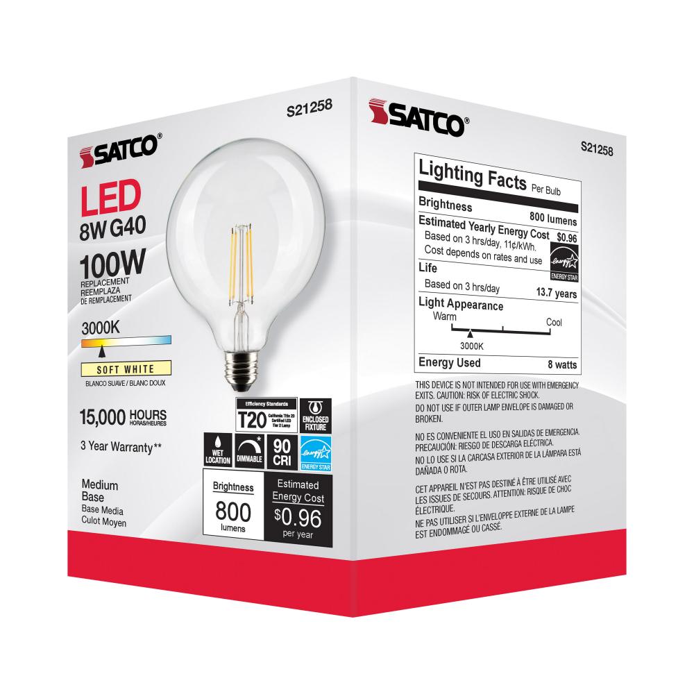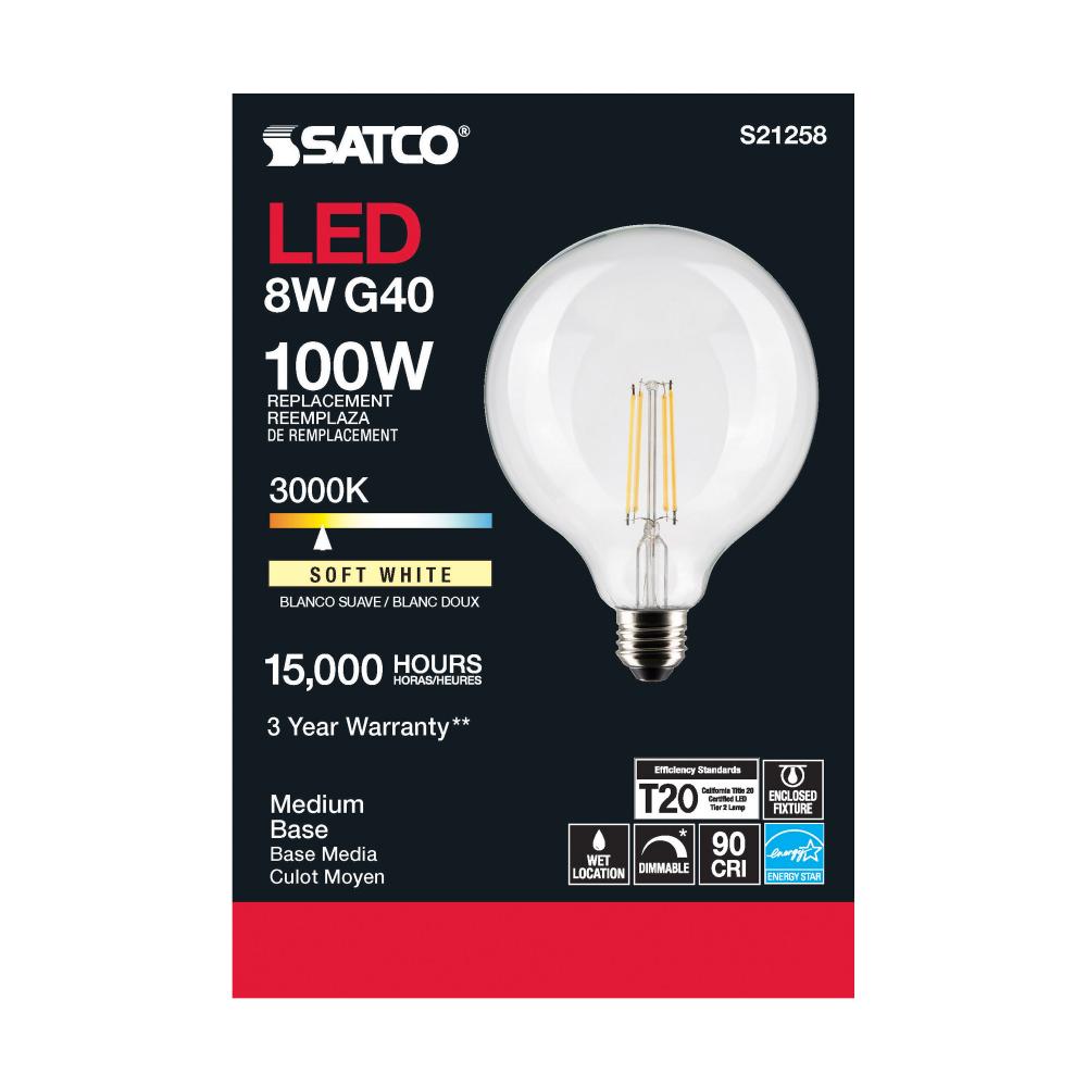 Satco's S21258 8-watt LED lamp is traditional, yet contemporary with its vintage style and energy saving LED technology. Elegantly illuminate any room in the house with this dimmable, globe shaped bulb. Sophisticated and modern, this lamp delivers 15,0