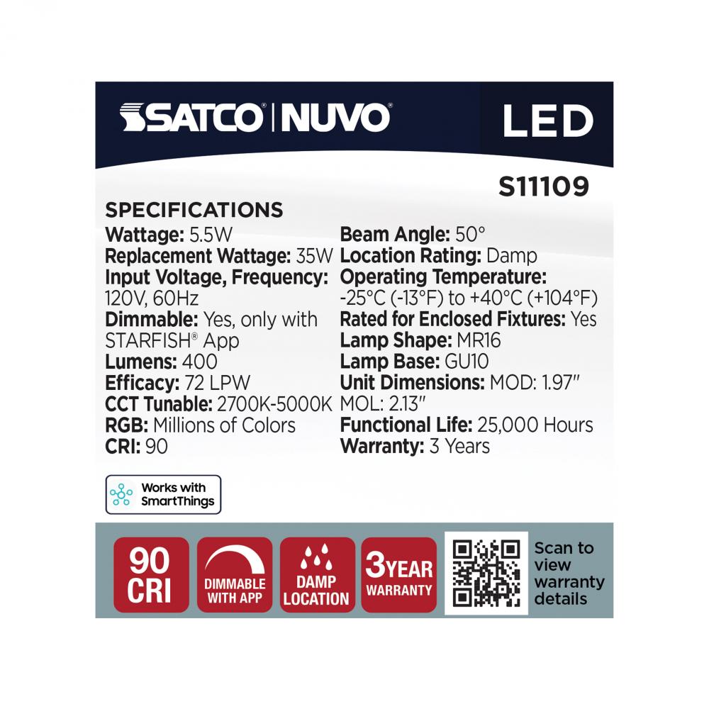 SATCO NUVO'S STARFISH SMART bulbs bring customizable lighting to any space with versatile shapes, from A19 to MR16, in E26, GU10, and GU5.3 base options. Each delivers 90+ CRI color accuracy, with tunable white light (2700K–5000K) and millions of RGB